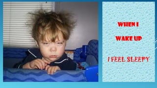 The document describes how a person feels in different daily situations. They feel sleepy when waking up, hungry after breakfast, and lazy going to school. Playing at the playground and with friends makes them happy and brilliant. They feel excellent when playing football and tired at night.