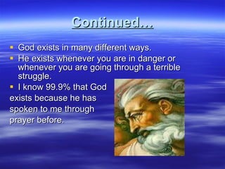 The document discusses several reasons for believing in God's existence. It states that God exists whenever people are in danger or struggling, and that 99.9% of people know God exists through prayer. God performs miracles like reviving Jesus from the dead. The author believes God exists based on experiences of hearing God speak in church and prayer during struggles. God brought the author into the world and helps their family with problems.