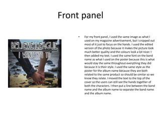 The document describes the design process for a digipack. For the front panel, the designer cropped an image from a magazine advertisement and added the band and album names in the same fonts used for other promotional materials. For the back panel, the designer included track listings and other standard elements like a barcode and logo. Side panels featured additional beach photos that were edited for consistency across the design.