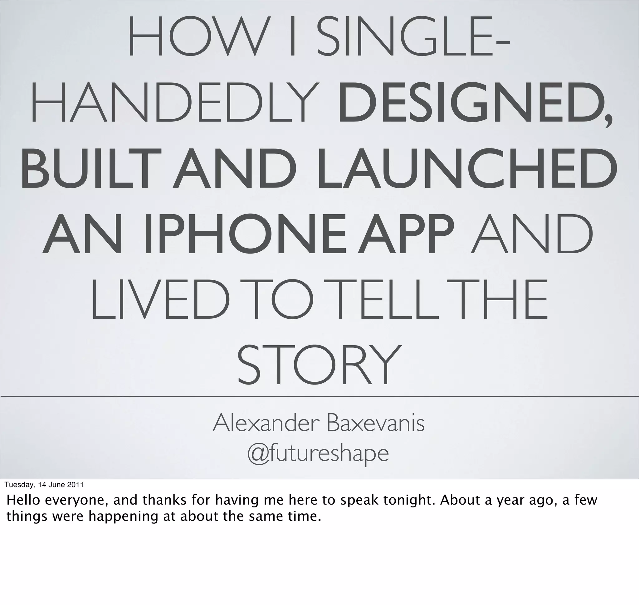 The document describes Alexander Baxevanis' experience in designing, building, and launching an iPhone app related to a cycle hire scheme in London, highlighting key lessons learned throughout the process. Baxevanis emphasizes the importance of using existing resources, shipping work rather than perfecting it excessively, and maintaining open communication with users for feedback. Ultimately, the experience taught him valuable insights about app development, user engagement, and the unpredictability of motivation over time.