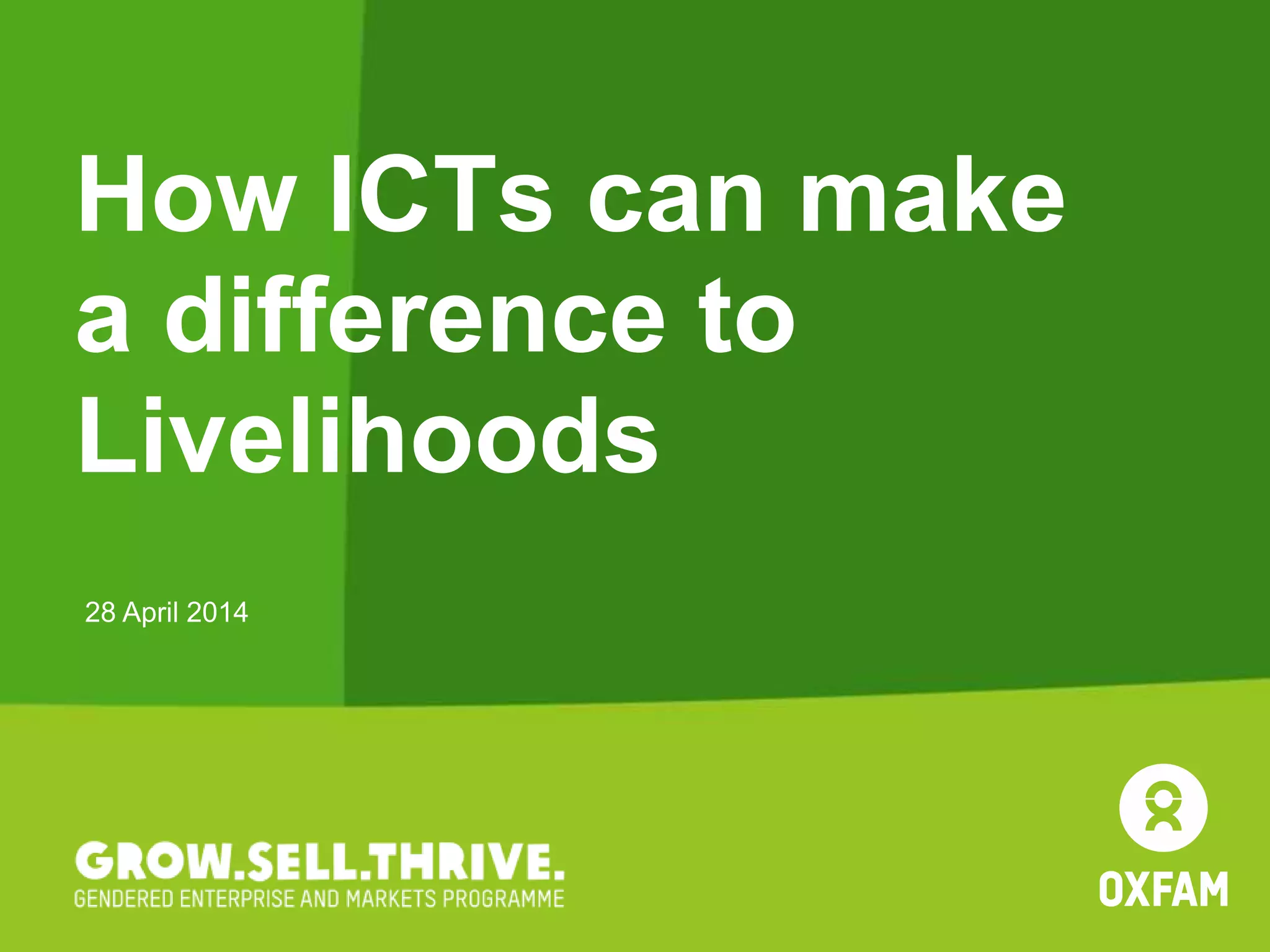 This document discusses how ICTs can be integrated into Oxfam's livelihood programs. It outlines key principles for success, including considering ICTs as enablers and embedding them in existing processes. It describes a 4-step process for integrating ICTs: 1) understand information and financial services ICTs can provide farmers, 2) identify opportunities for ICT use, 3) analyze the ICT landscape, and 4) identify synergies between opportunities and existing services. Challenges and opportunities for women are discussed. The document also covers mobile data collection tools, remote reporting, and a vision for ICTs in Oxfam's future programs.