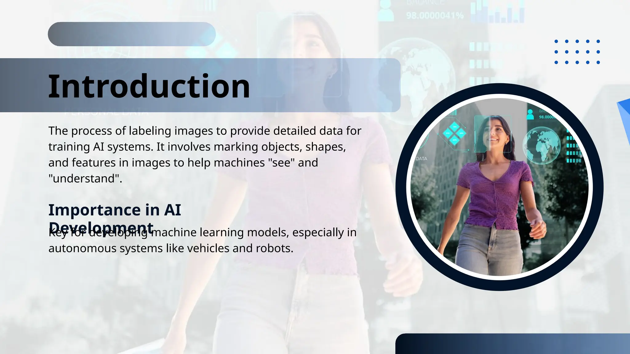 The document discusses the significance of image annotation in training AI systems, particularly for autonomous vehicles and robotics. It emphasizes the need for high-quality, accurate labeling of images to ensure safe navigation and effective operation in diverse real-world scenarios. Key applications and challenges in the annotation process are highlighted, along with examples of companies utilizing these methods.