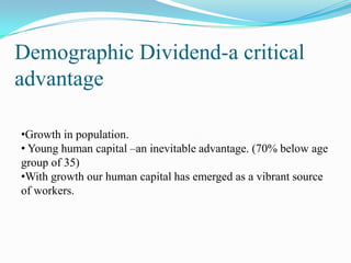 India is managing its large and young population through leveraging its demographic dividend while also facing challenges. Over 70% of India's population is under 35 years old, providing a large workforce but high unemployment. Problems include poor education, gender gaps, lack of family planning and scarce resources. To fully utilize its demographic opportunity, India must improve education quality to develop its human capital and boost economic growth through system planning and infrastructure development.
