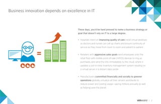 This document discusses how intelligent operations with VMware vSphere and vSphere with Operations Management can enable proactive data center management and help IT transform into a strategic partner for businesses. It outlines three strategic imperatives for IT: 1) quickly and flexibly serve business needs, 2) ensure high performance and availability, and 3) act as a strategic partner rather than cost center. vSphere with Operations Management provides intelligent operations, consistent management, automation and control, and tangible results that help IT achieve these imperatives and transformation.