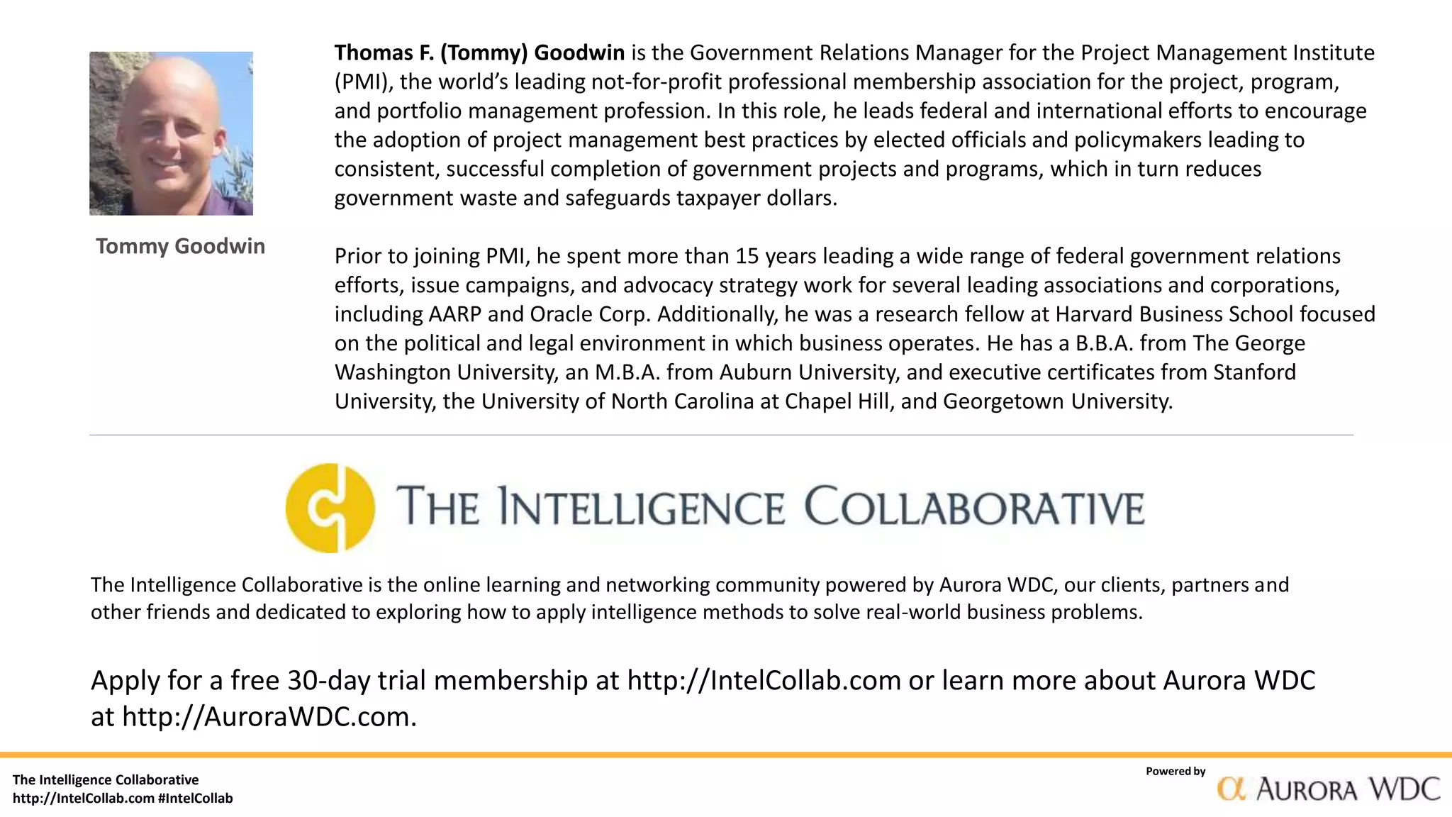 The document summarizes a webinar on how intelligence can drive public policy change and create nonmarket advantage for organizations. It discusses definitions of key terms, the business case for strategic public affairs engagement, goals and strategies for public affairs, examples of tactics, and the role intelligence can play. Intelligence is described as helping to identify new opportunities, provide early warnings, evaluate issue prospects, and anticipate nonmarket shifts. Successful integration of intelligence and public affairs involves initial and ongoing communication between teams.