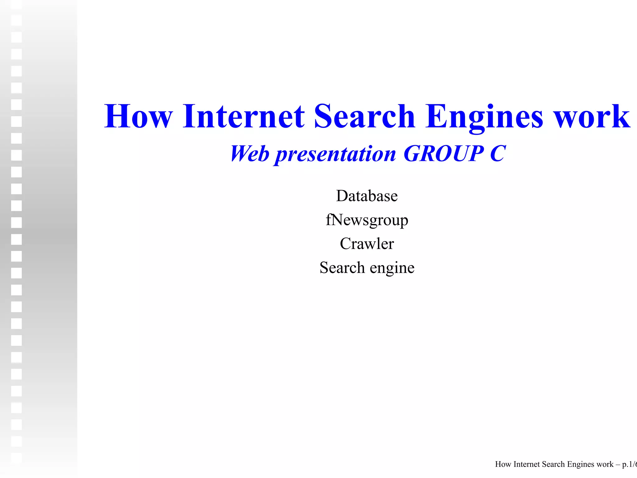 Internet search engines work by using crawlers to collect information from websites and save them to databases. The databases contain the full text of web pages that crawlers access. Search engines then allow users to search these databases using keywords to retrieve relevant information from the stored web pages.