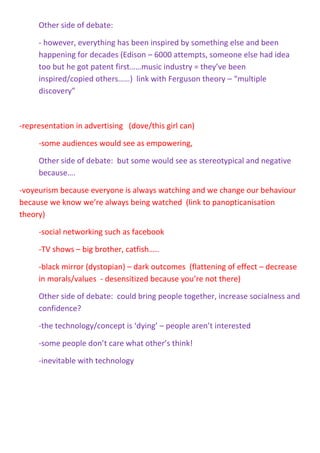 3) Constant exposure to mediated realities and surveillance through social media may lead to desensitization, a loss of privacy, and changes in behavior as audiences perform to outside views per theories of the panopticon.