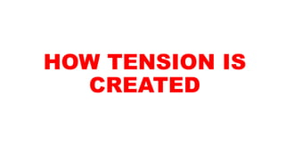 Tension can be created in films through several techniques according to the document. Close-ups that focus attention on one element make audiences feel more enclosed and draw them in. Long, uncut shots that don't change focus also build tension as audiences concentrate on finding clues. Silence can create unease by allowing imagination to fill the void, while isolated sounds like breathing become amplified. Music is also used, with increasing tempo building to a climax or silence heightening tension. Several film examples demonstrate these techniques in action.