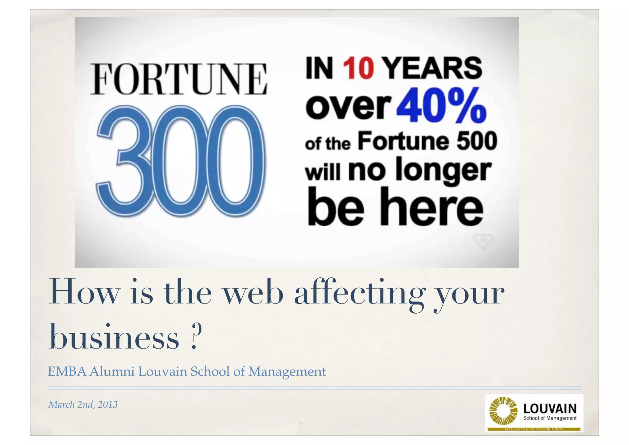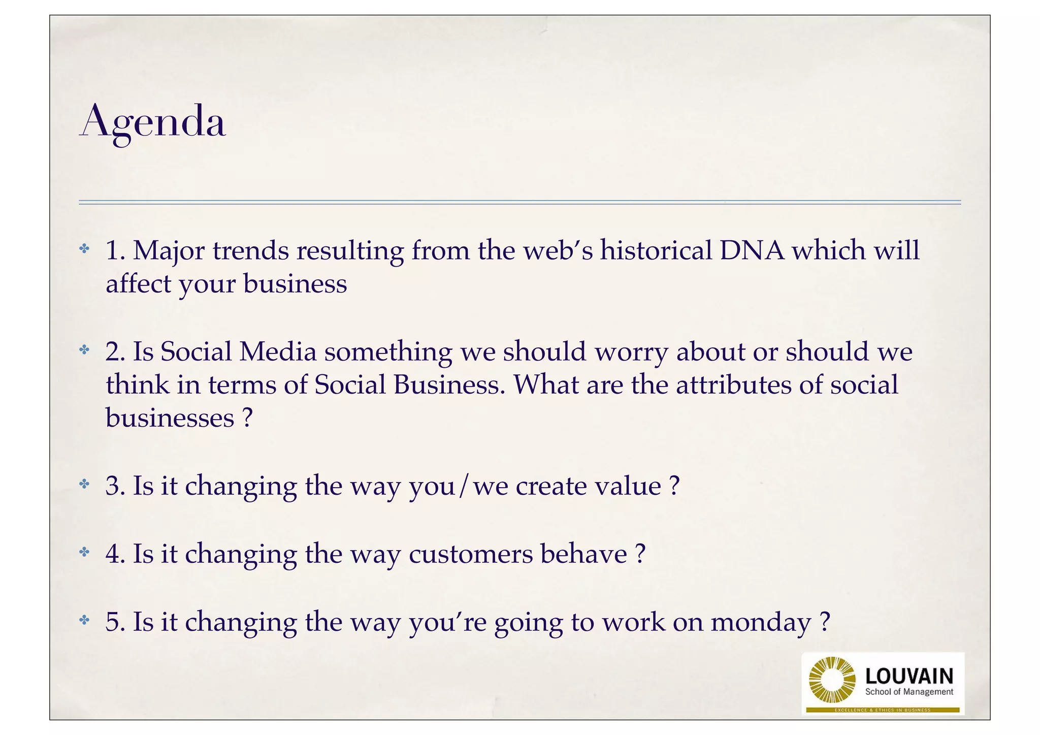 The document discusses how the web is affecting businesses. It covers major trends like participation and user-generated innovation. It discusses how social media is changing how customers behave and how businesses create value. Companies need to think about becoming media companies that provide constant content to users. The customer decision journey is now more complex, as customers research companies online at every moment. Everything a company does now contributes to its marketing and brand.