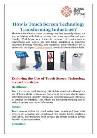 In this PDF, we explain how touch screen technology is changing industries by making interactions easier and more efficient. Learn about its benefits and uses in different fields. For Touch Screen Rental in Dubai, contact Techno Edge Systems LLC at +971-54-4653108 for helpful solutions that fit your needs. Visit us- https://www.laptoprentaluae.com/touch-screen-rental-dubai/