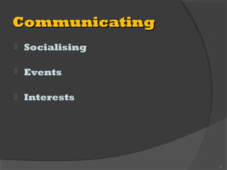 The document discusses how information technology helps with communicating, entertainment, and productivity. It outlines how social networking, mobile phones, and email allow people to socialize and learn about events. Entertainment options like television, gaming, and internet browsing are also described. Finally, the document notes how technology enables activities like email, online shopping, working on documents, and cloud storage for productivity.