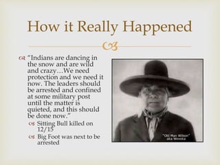 Big Foot and around 350 Lakota Sioux, including many women and children, were surrounded by the US Army at Wounded Knee Creek in South Dakota in December 1890. A medicine man performed a sacred dance for the tribe. Tensions escalated when a deaf tribesman struggled to relinquish his weapon, and shots were fired by both sides. Over 150 Lakota men, women, and children were killed by the Army in the Wounded Knee Massacre, one of the final major conflicts of the American Indian Wars. Big Foot died along with many others, as the Army also suffered casualties from friendly fire.
