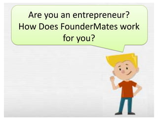 FounderMates is a platform that connects entrepreneurs with business and functional experts. Entrepreneurs can select an expert from FounderMates' curated list, buy coupons to book sessions to discuss challenges and determine if an expert is a good fit. FounderMates will then design an engagement model outlining how the expert will work with the entrepreneur based on objectives and budget. FounderMates handles contracting with the expert and ensures smooth delivery of the engagement from start to finish. The platform aims to help entrepreneurs get expert advice and solutions for their startup problems as it has done for others in the past.