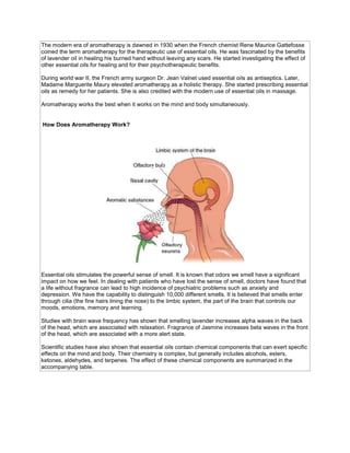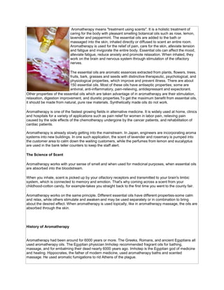 Aromatherapy involves using essential oils extracted from plants and flowers to promote health and well-being. Essential oils can be inhaled, applied topically, or diffused and have properties like relaxation, pain relief, and stress reduction. Different oils impact the brain and nervous system through the olfactory nerves to produce calming or stimulating effects. Aromatherapy has been used for thousands of years and works by activating the limbic system through the sense of smell.