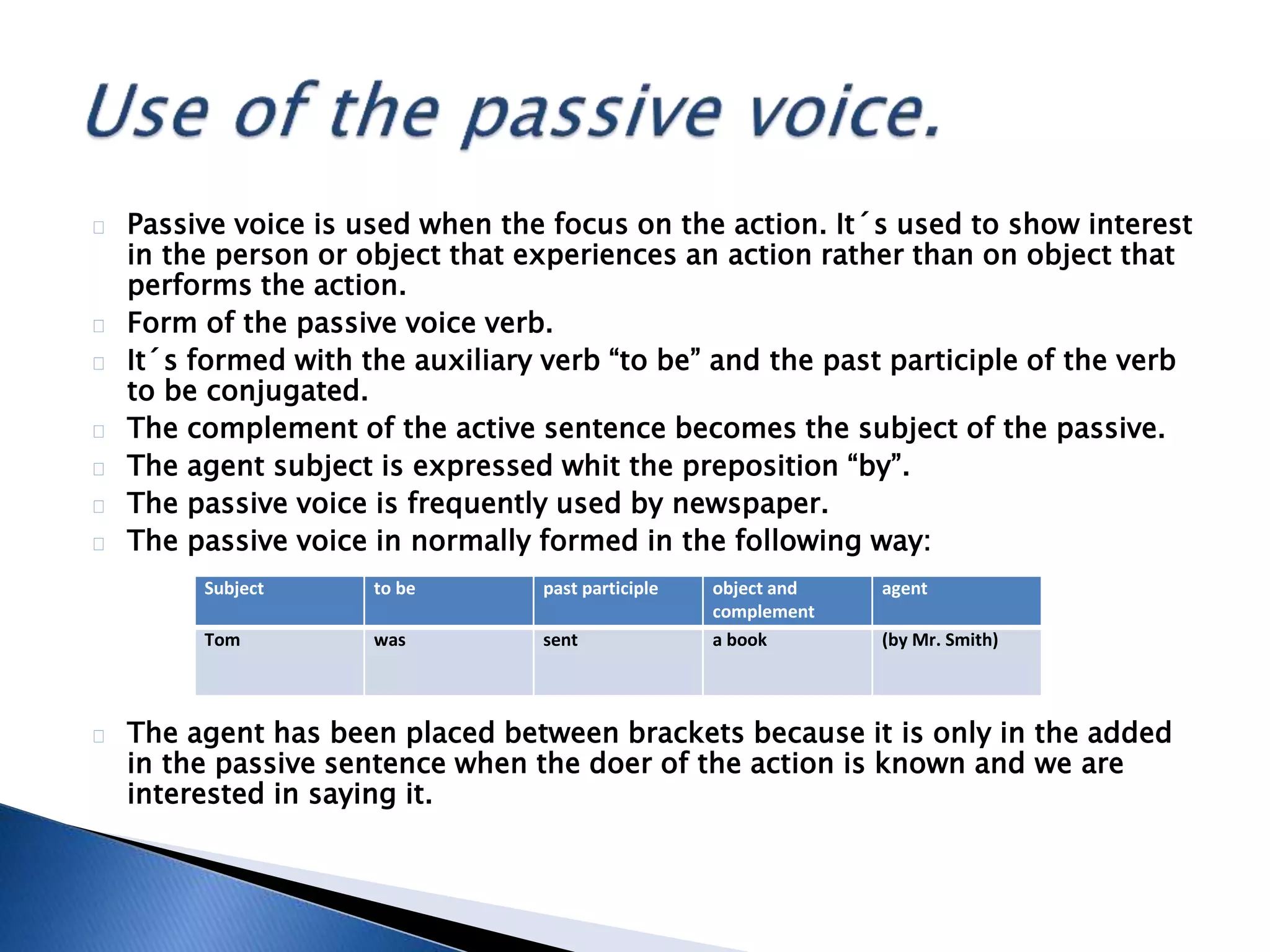 The document discusses passive voice and how it is formed. Passive voice focuses on the recipient of the action rather than the doer. It is formed using the auxiliary verb "to be" and the past participle of the main verb. The subject and object from the active sentence switch places in the passive construction, and the doer can be mentioned using "by". Examples are provided of changing active sentences to passive voice in different tenses.