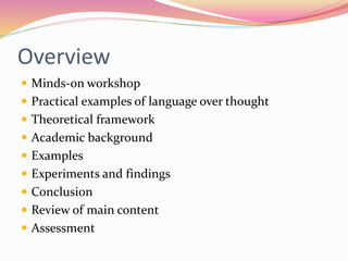 The document discusses the relationship between language and thought, emphasizing that language habits influence thinking habits, as supported by the Sapir-Whorf hypothesis and various studies. It highlights recent research on how language affects perception and cognitive processes, including color perception and agency construction. The overview includes findings from notable experts and references key experiments demonstrating that differences in language can result in differences in thought and memory.
