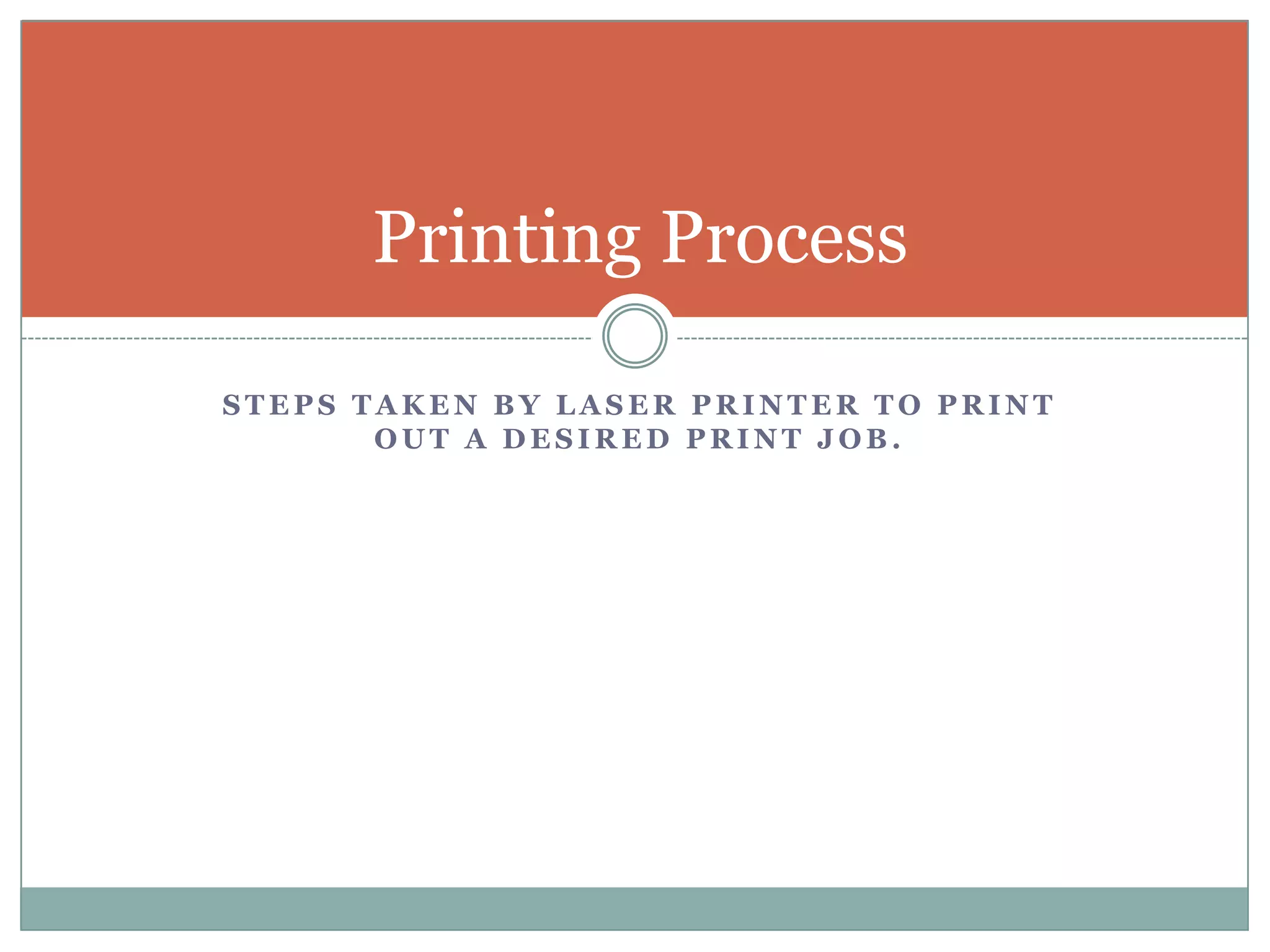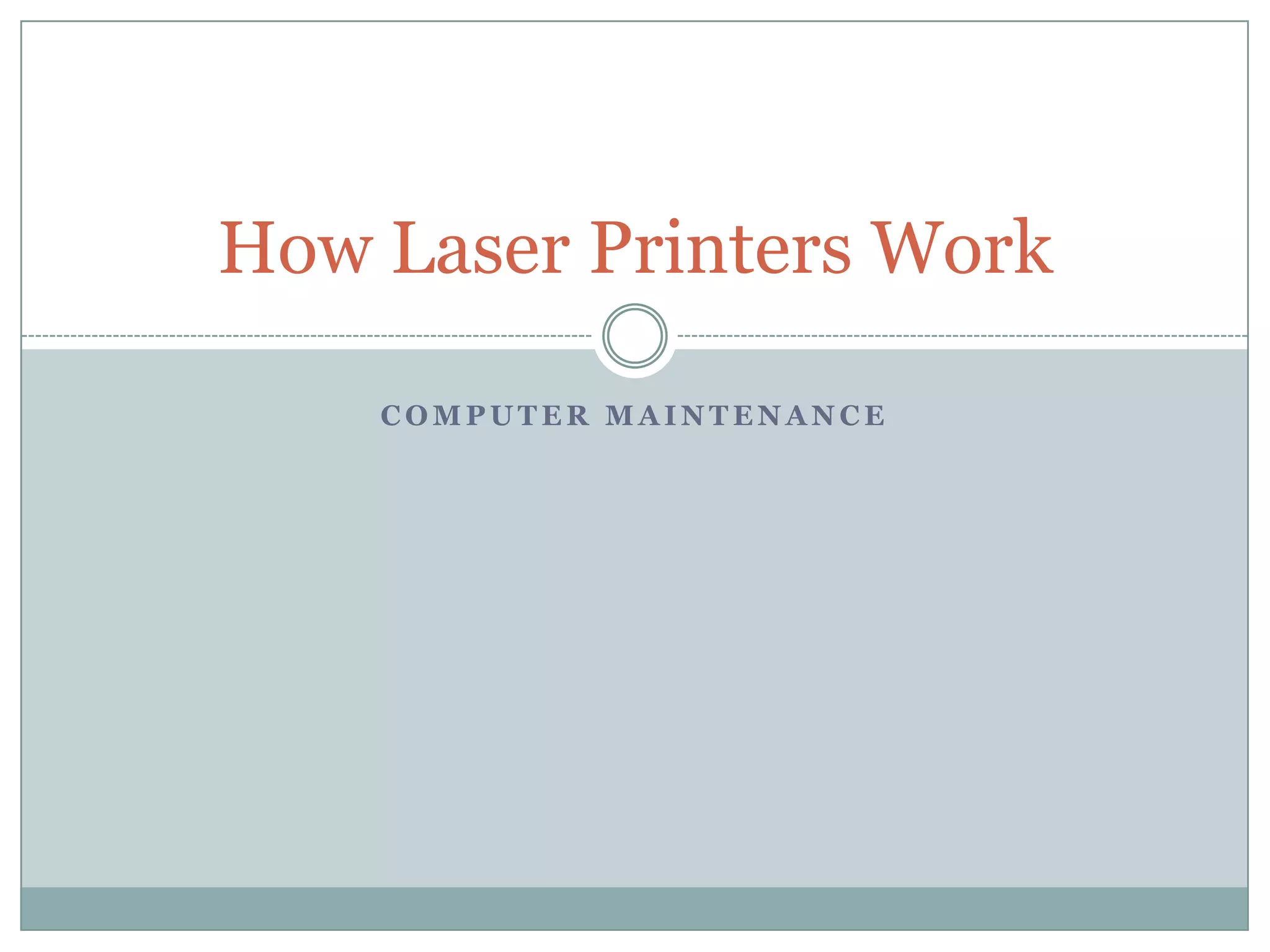 A laser printer uses a series of steps to print out a job from a computer. It starts by cleaning the drum and charging it with an electric current. Then a laser traces the page image on the drum by selectively neutralizing the charge. Toner powder sticks to the discharged areas and is transferred to paper, where it is fused into place with heat rollers.
