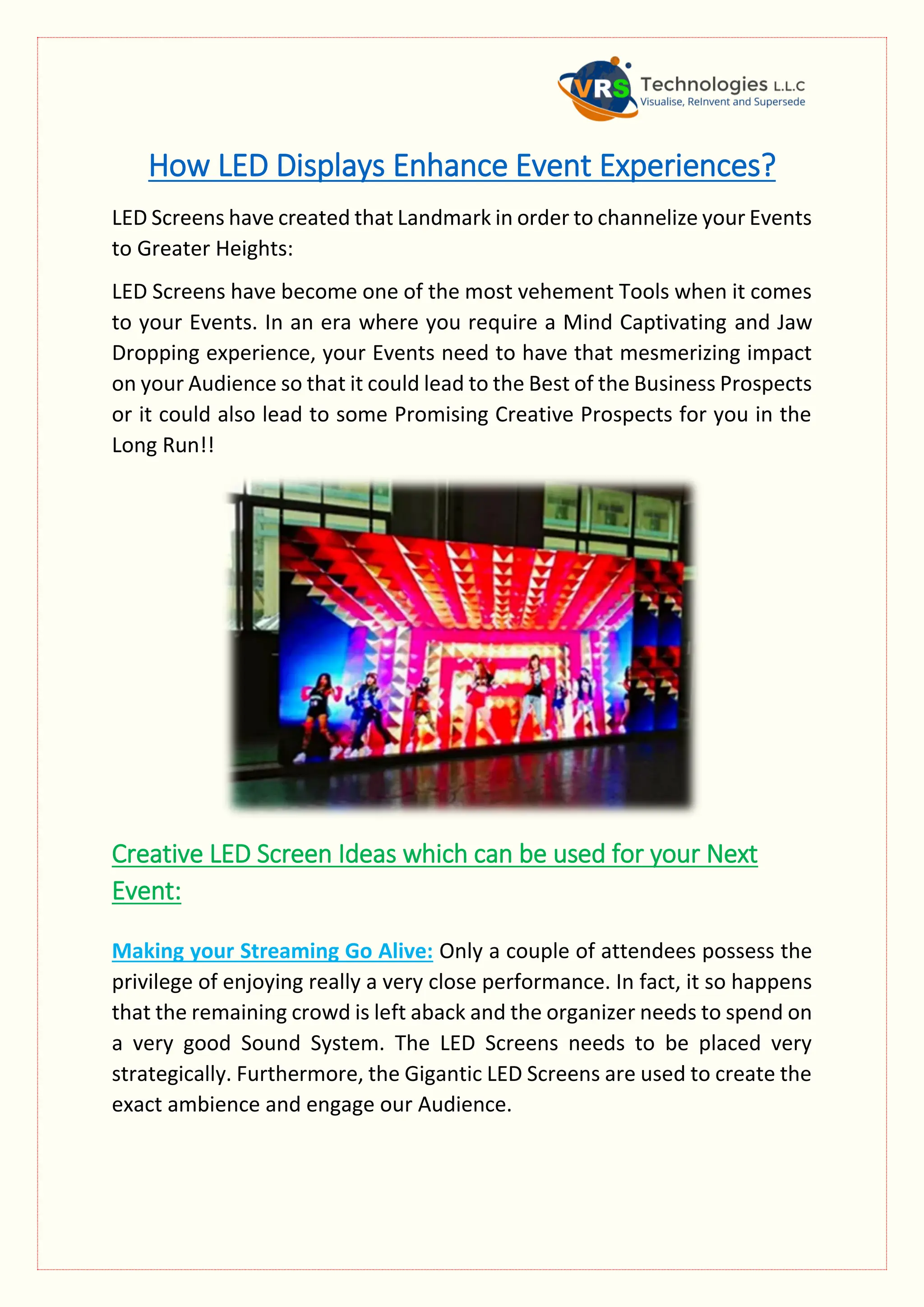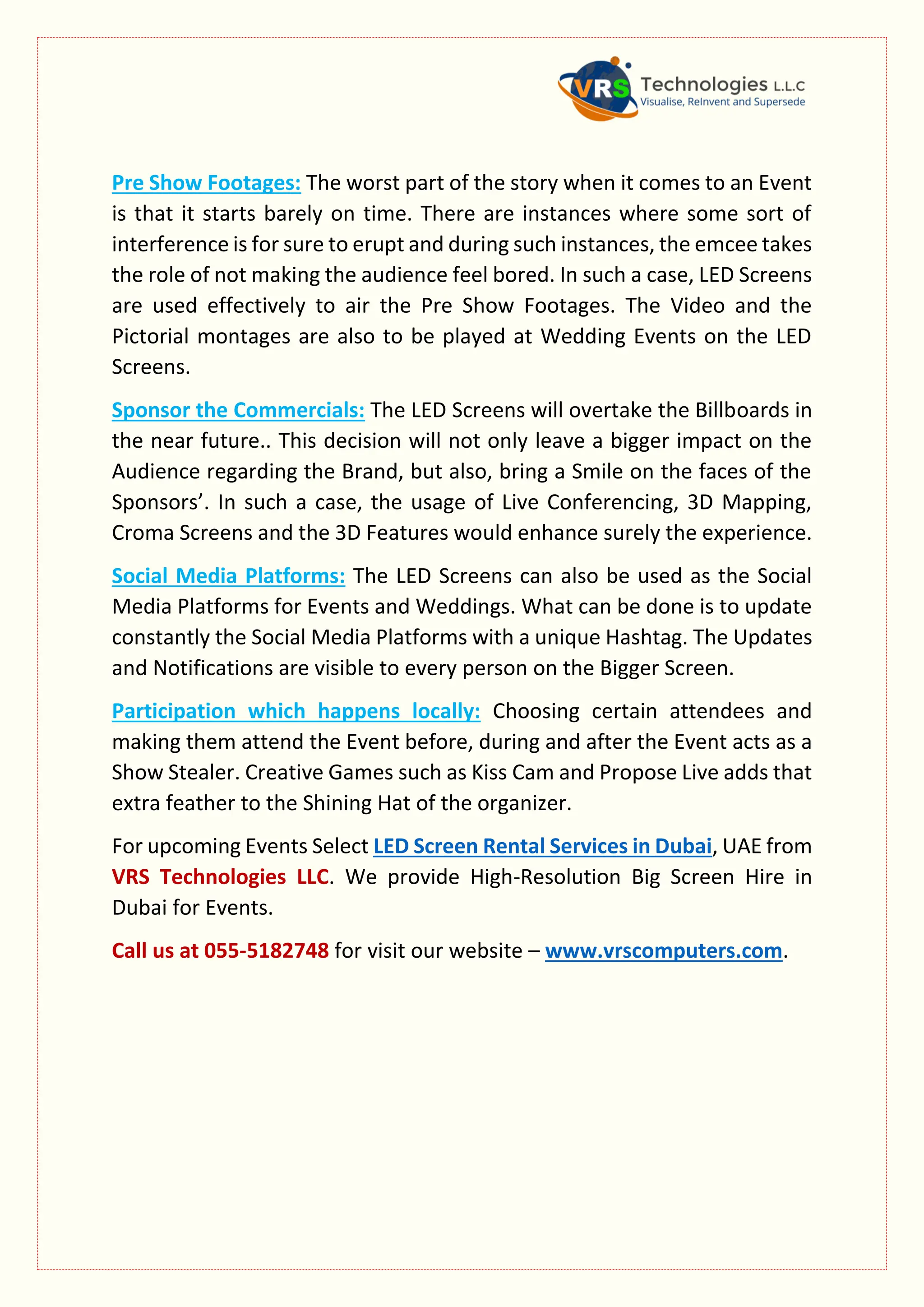Here Explain, How to Use LED Display Screens for Immersive Events. VRS Technologies LLC provide LED Screen Rental Services in Dubai, Abu Dhabi, Sharjah, and Across the UAE. For more info visits our website.