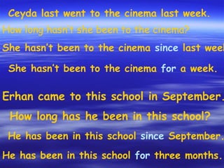 The document contains examples of sentences using phrases such as "how long", "since", and "for" to indicate durations of time or periods. It provides contexts like "Ceyda last went to the cinema last week" and "Erhan came to this school in September" to demonstrate how these temporal expressions are used to specify lengths of time for different actions, events, possessions and situations.