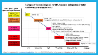 This document discusses guidelines for lowering LDL cholesterol levels to reduce cardiovascular risk. It notes that while normal LDL levels are considered low risk, even normal levels still carry some risk. Current guidelines recommend lowering LDL as much as possible, by at least 50%, with a target under 70 mg/dL or lower for high-risk patients. Clinical trials have shown lower LDL levels are associated with greater risk reduction, down to levels under 40 mg/dL, though very low levels below 25 mg/dL require more evidence. Potential safety risks of extremely low levels are also examined. The conclusion emphasizes the importance of early detection and management of dyslipidemia to prevent cardiovascular disease.