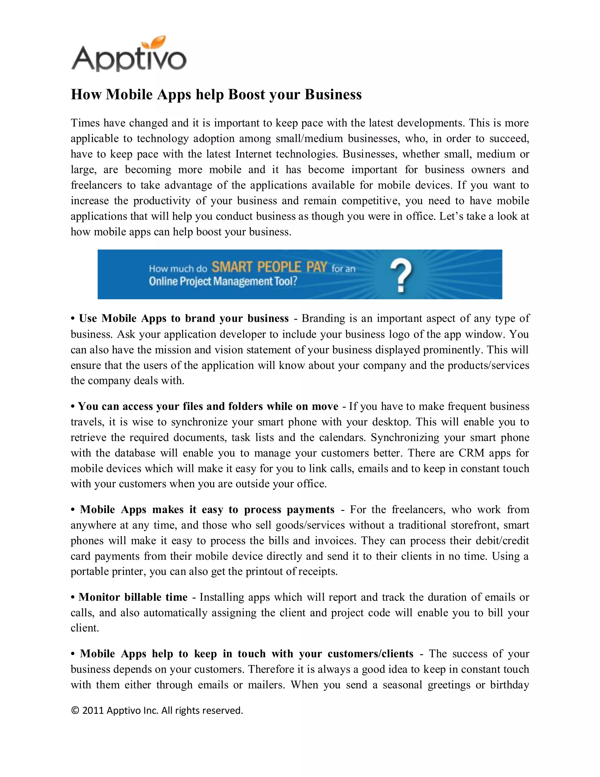 The document discusses how mobile apps can help boost businesses. It provides examples such as using apps to brand a business with logos and mission statements. Apps allow accessing files and folders while traveling to manage customers better. They make it easy to process payments for freelancers and track billable time. Apps also help keep in constant touch with customers and send them regular updates. They allow collecting accurate data through surveys. The document concludes that mobile devices and apps increase productivity and businesses should adopt this technology.