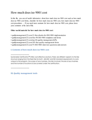 The document discusses the costs associated with ISO 9001 certification. It explains that the fees can vary depending on factors like the scope of the business, risks involved, size of the business, and number of locations covered. The costs include both fixed fees for certification requirements as well as additional costs unique to each business. It also provides additional resources on topics related to ISO 9001 certification requirements, training, audits, and more.