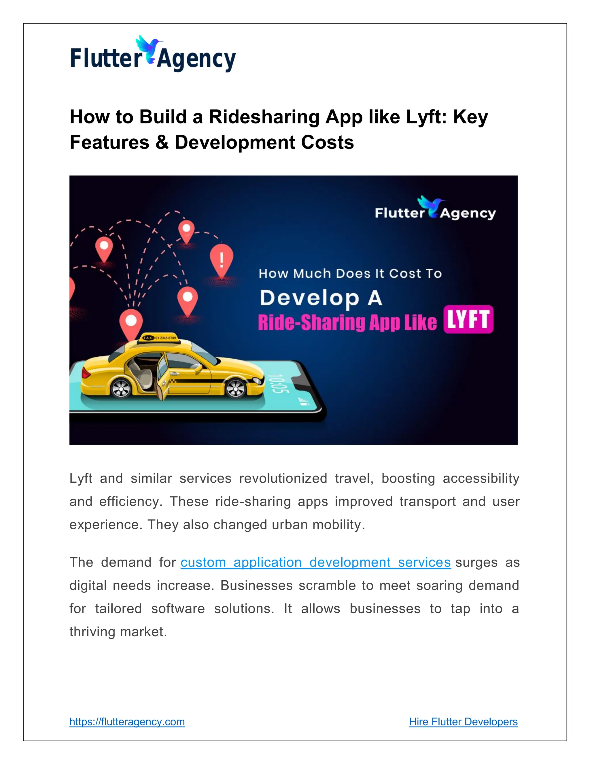 The document outlines the increasing global demand for ride-sharing apps like Lyft, projecting the industry's growth to $691.63 billion by 2034. It details essential features for successful ride-sharing applications, such as seamless user experiences, real-time data processing, and robust safety measures, as well as discusses the technology stack and costs involved in app development. Trends like the integration of electric vehicles and autonomous driving technology are highlighted as key factors shaping the future of urban mobility.