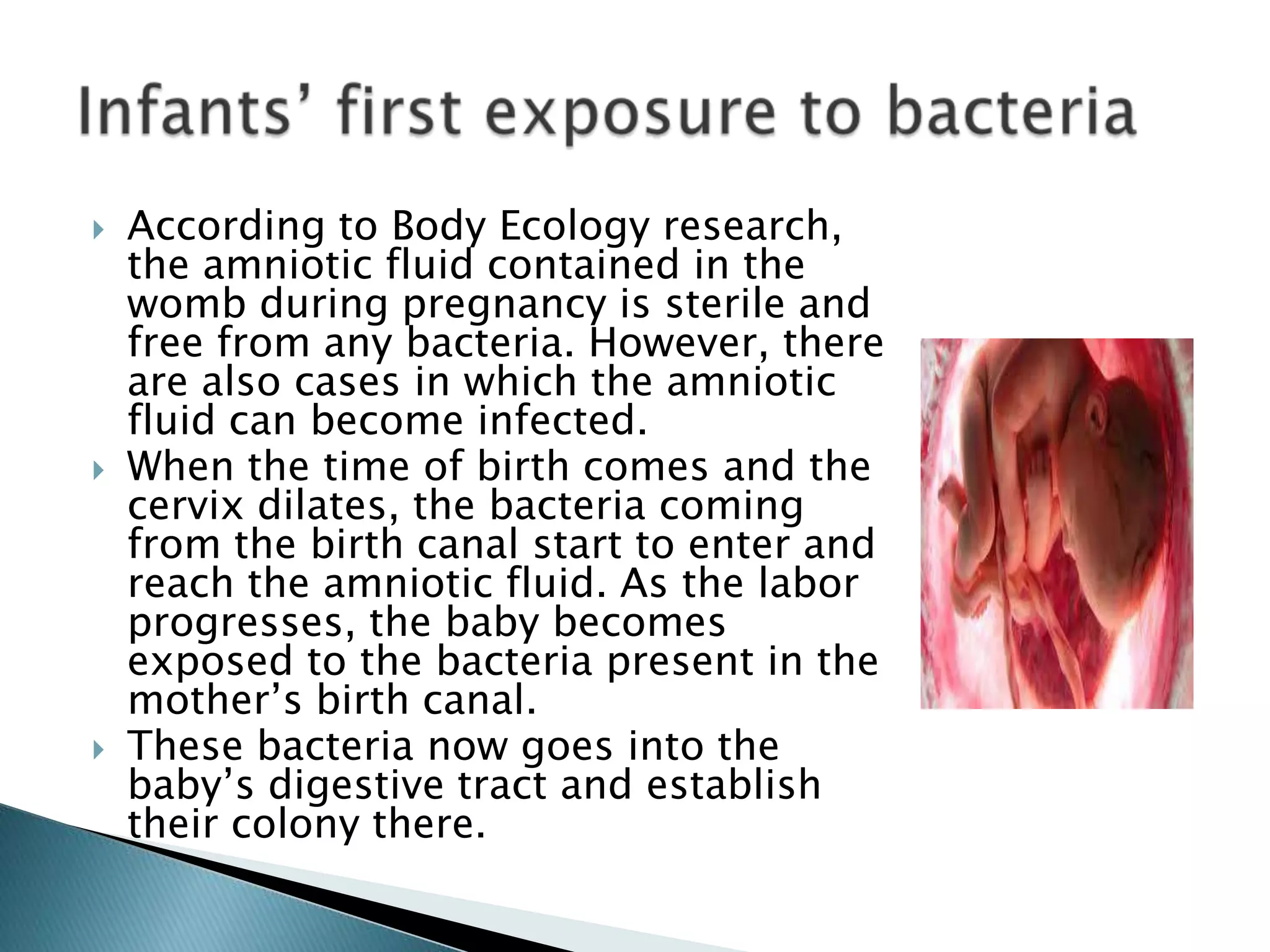 The document discusses the importance of probiotics for infants, emphasizing that beneficial bacteria from the mother can help establish a healthy digestive system during birth. Probiotics are shown to enhance immunity and reduce the likelihood of allergies and gastrointestinal issues in infants, particularly those born preterm or with low birth weight. Guidelines for probiotic use in infants, including recommended dosages and precautions for administration, are provided, alongside the need for further research to ensure safety.