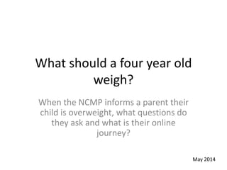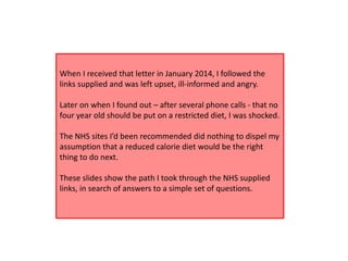 The document recounts a parent's frustrating experience navigating the NHS resources after being informed that their four-year-old is overweight. Initially, the parent found the information unhelpful and misguiding, as it suggested calorie restriction, which is not recommended for young children. Ultimately, the parent discovered valuable resources, particularly from 'portionwise.net', emphasizing that children should not undergo calorie restriction.