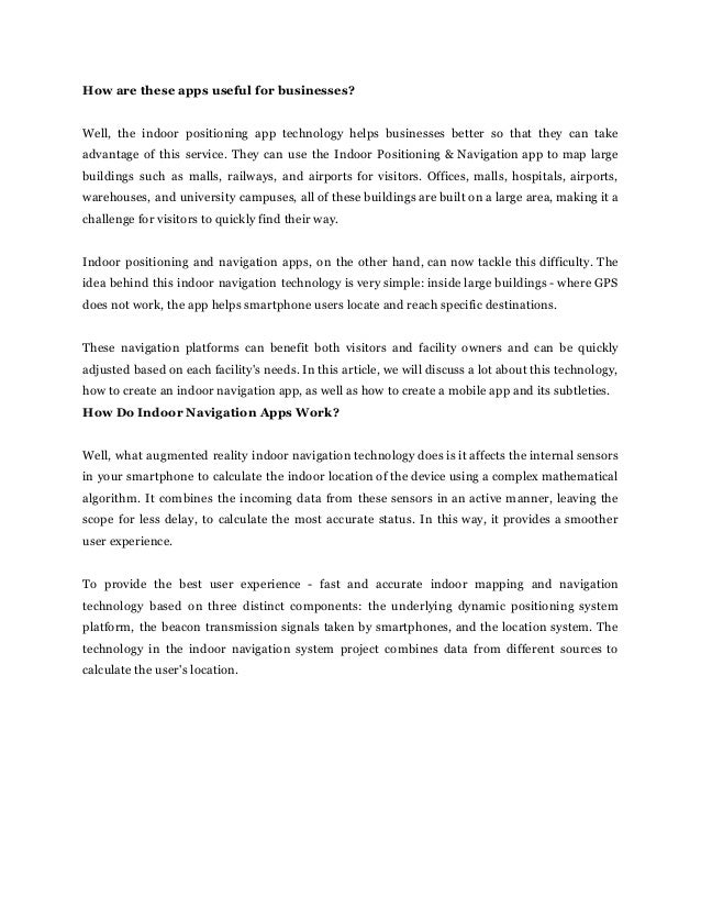 Indoor navigation apps are designed to help users navigate large complexes where GPS signals are ineffective, such as malls, hospitals, and airports. These apps provide features like real-time localization, mapping, and analytics to enhance user experience and cater to businesses. The technology incorporates augmented reality and customizable designs to improve navigation and facilitate visitor management for facility owners.