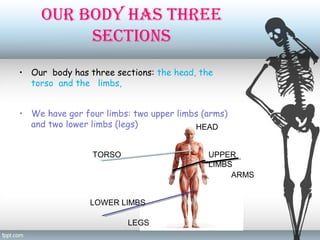 Our body has three main sections - the head, torso, and limbs. The skeleton is made up of many bones that support and protect the body. The skull protects the brain and ribs protect the lungs and heart. Muscles connect to bones and work in pairs to pull bones and allow movement. Joints are where two or more bones meet, and the body bends at joints with help from muscles. We need to protect our body from accidents by being alert, wearing protective gear like helmets and knee pads, and choosing appropriate clothes for exercise.