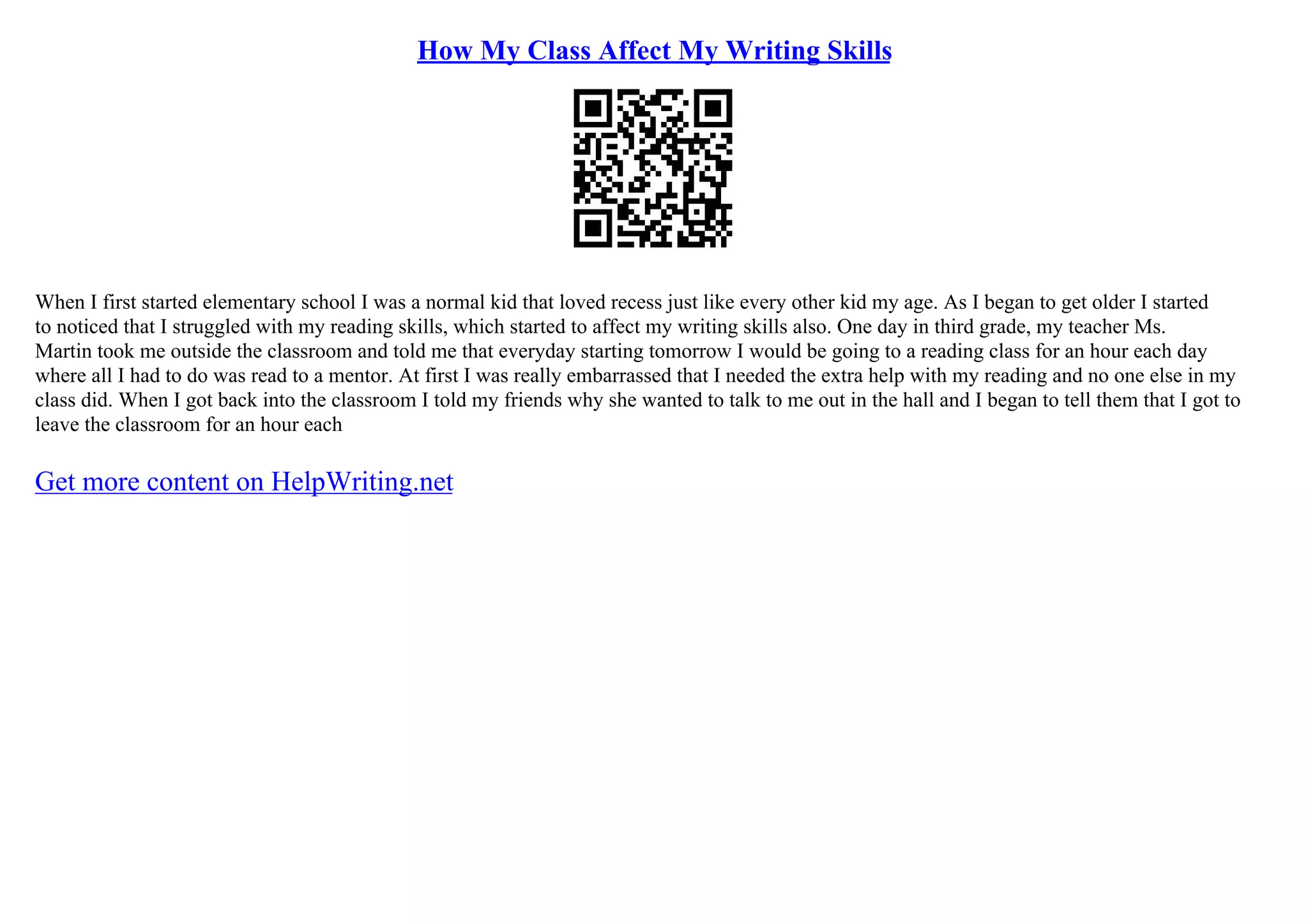 The author reflects on their struggles with reading and writing skills starting in elementary school, noting that these challenges began to surface as they got older. In third grade, their teacher enrolled them in a reading class where they would read to a mentor, initially feeling embarrassed about needing extra help. Despite these feelings, they eventually shared their experience with friends, indicating a level of acceptance and understanding of their situation.