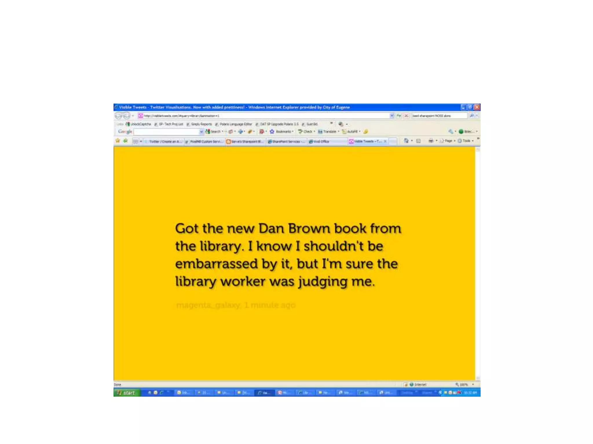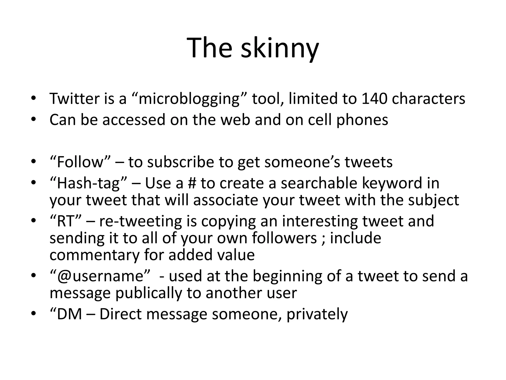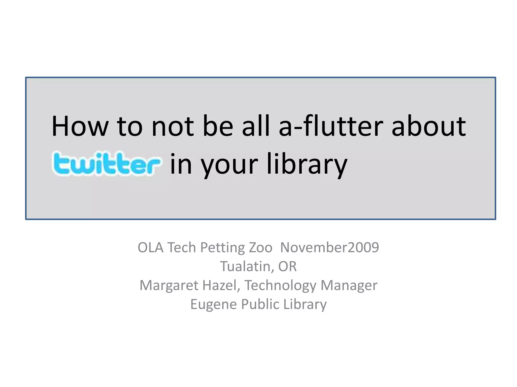 Margaret Hazel discusses how to use Twitter effectively for libraries. She explains basic Twitter terminology and functions. Hazel also outlines how Eugene Public Library uses Twitter, including posting events 2-3 times per week. She discusses goals of using Twitter institutionally and professionally. Hazel provides tips on developing social media policies and managing a library's Twitter presence and interactions.