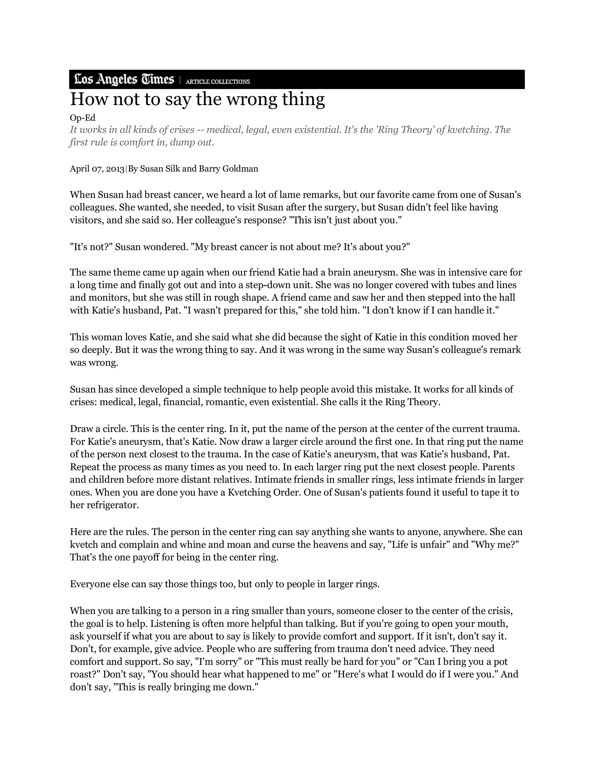 Susan developed the "Ring Theory" after experiencing breast cancer and witnessing a friend's brain aneurysm. The Ring Theory provides guidance on supporting those going through trauma by drawing concentric circles representing degrees of closeness to the person experiencing hardship. The inner ring contains the individual at the center of the crisis, while outer rings include those increasingly further removed. The rules state that the person most affected can express negative emotions to anyone, while others can only share such feelings with those in larger, outer rings further from the center. This aims to ensure those closest receive comfort rather than complaints or burdens from others.