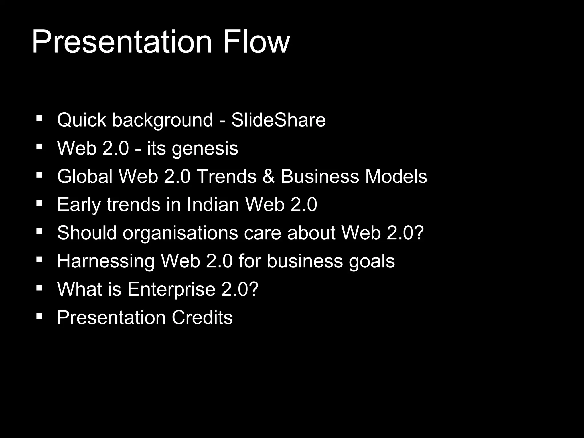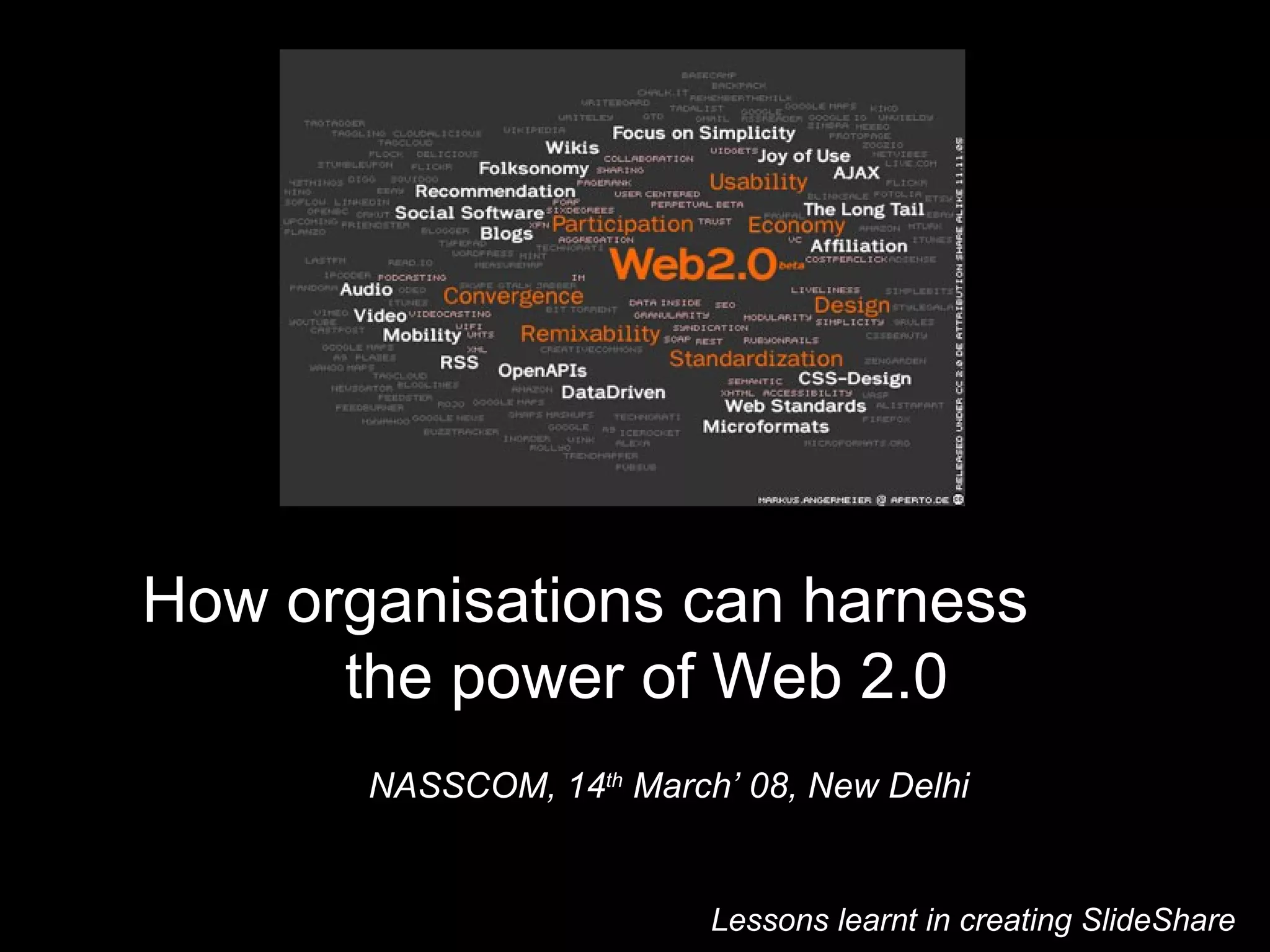 The document presents a comprehensive overview of Web 2.0 and its implications for organizations, highlighting its evolution, trends, and potential business models. It discusses the role of user-generated content, the importance of community engagement, and the shift in consumer control over marketing conversations. Additionally, the document emphasizes the need for organizations to leverage Web 2.0 tools and strategies, such as social media and blogs, to enhance brand visibility and consumer interaction.