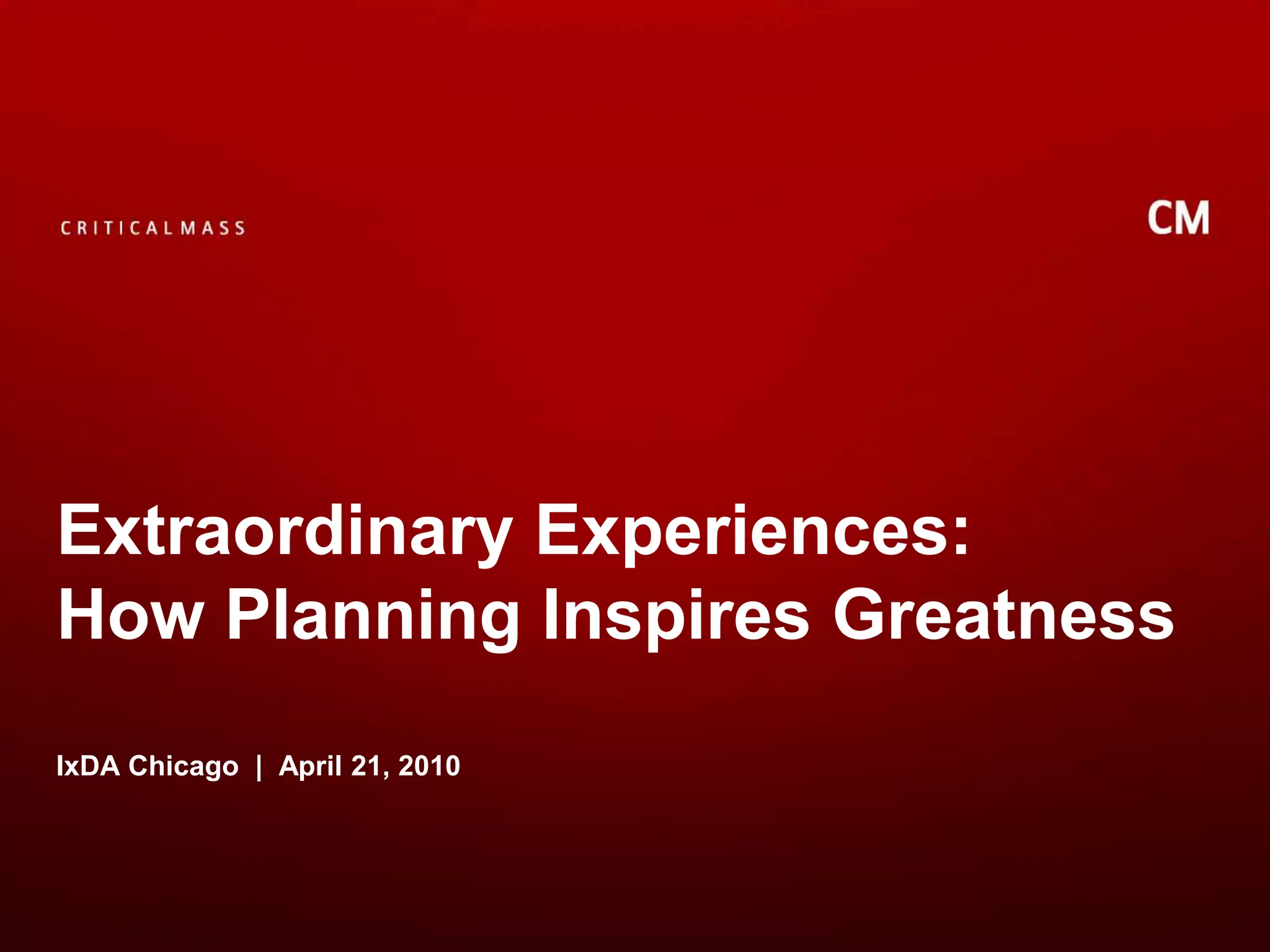 The document discusses planning and its importance in inspiring greatness through extraordinary experiences. It defines planning as bringing people's needs and desires into the development process creatively. Planning matters because consumers control information and brands need ambassadors. The document outlines Critical Mass's planning process and two case studies, one helping engineers choose parts and the other getting craft beer fans to try a mega brand. It ends with a discussion of the future of planning.