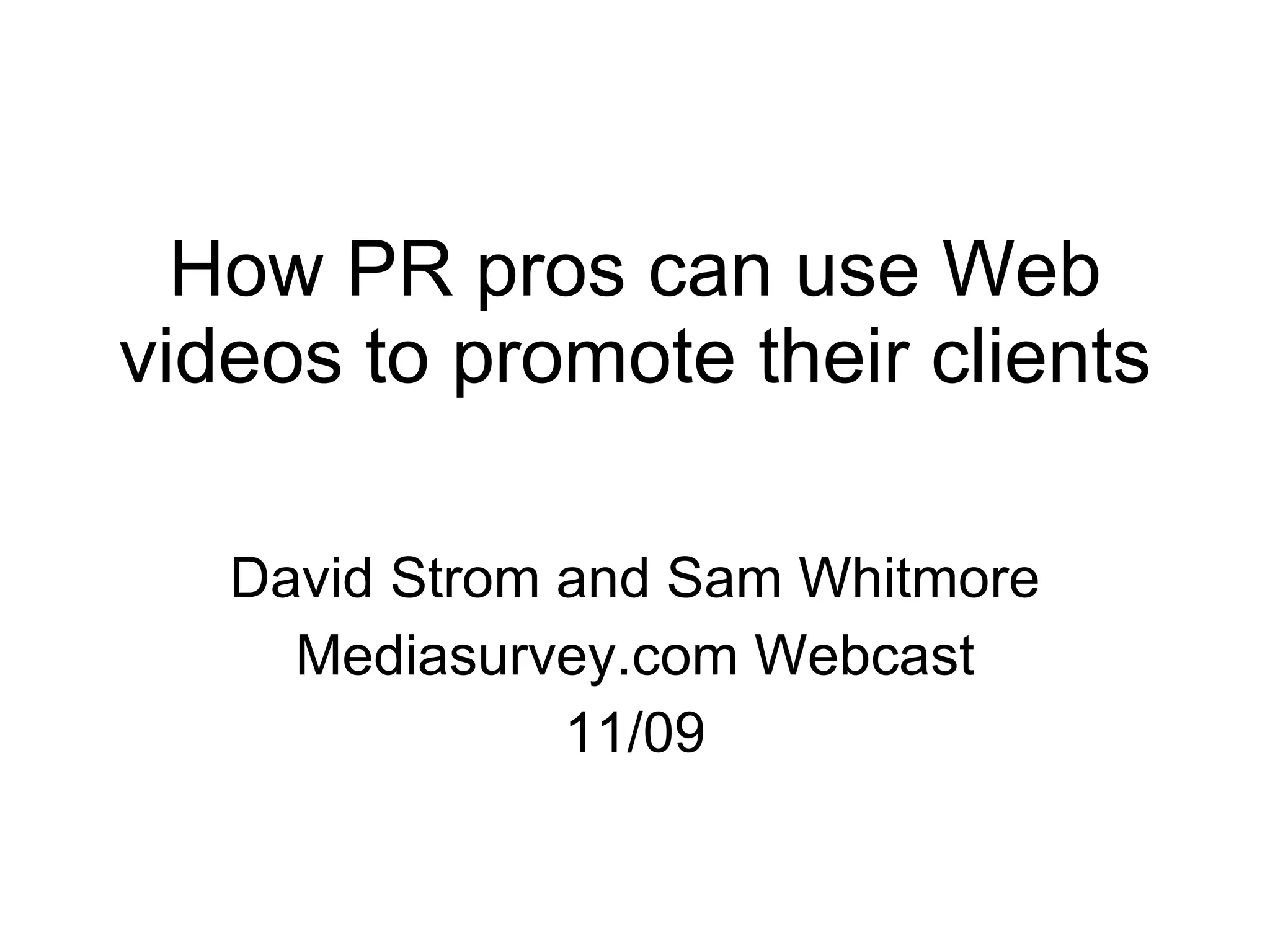 The document outlines how PR professionals can utilize web videos to enhance client promotion, emphasizing benefits like increased website visits and accelerated customer engagement. It discusses essential tools for content creation and distribution, highlighting the importance of audio quality, screen resolution, and effective video hosting services. Additionally, it stresses the significance of SEO practices, audience retention, and the role of platforms like YouTube in video visibility.