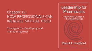 Chapter 11 discusses the importance of trust in professional relationships and introduces the 'credos' framework to define and enhance trust. Key aspects include competence, respect, equity, dependability, openness, and support, which are essential for fostering cooperation and communication among partners. The chapter emphasizes that trust is critical for committed relationships and offers strategies to develop and maintain it effectively.
