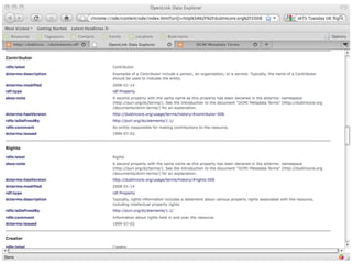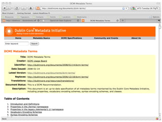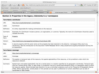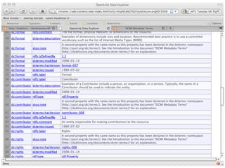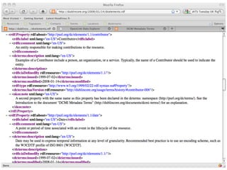 RDFa is a method for embedding Rich Data Formats metadata within HTML documents. It allows metadata like titles, descriptions and URLs to be added to HTML pages in a way that is readable both by humans and machines. The summary describes how RDFa works by defining things with URIs and assigning them properties and values as triples. It also mentions the RDFa distiller tool that can extract the RDF metadata from HTML pages marked up with RDFa.