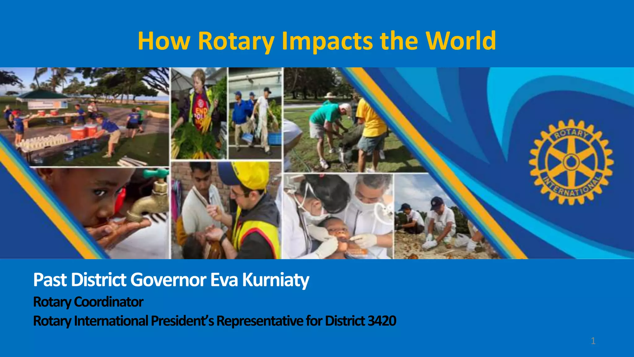 Rotary International is an international service organization with 1.2 million members that aims to unite business leaders and professionals to provide humanitarian services worldwide. Some key accomplishments of Rotary include: