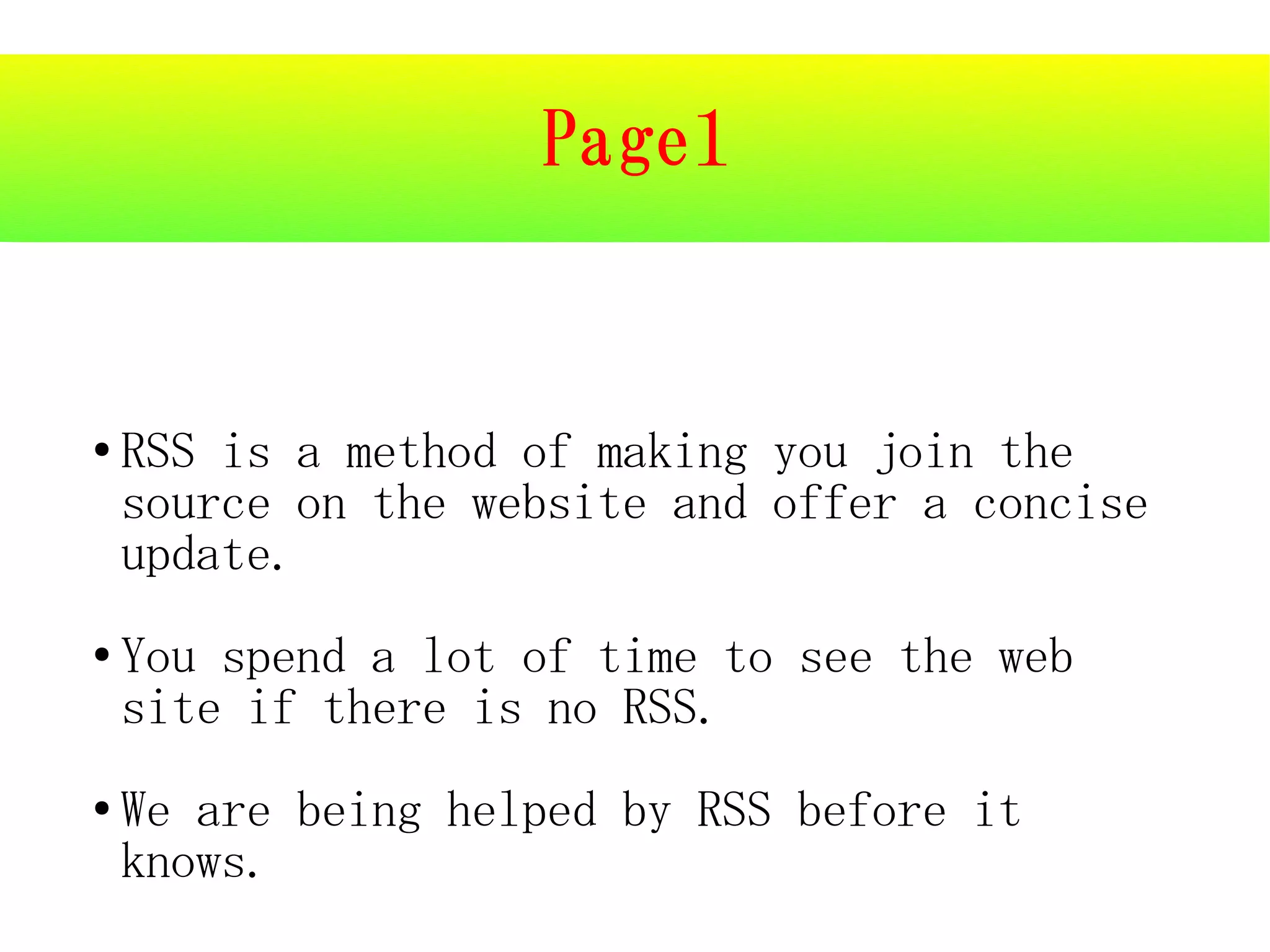 RSS allows users to subscribe to frequent updates from websites and see condensed summaries of new content without visiting each site individually. An RSS aggregator collects feeds from multiple sources into a single location, making it easier for users to stay informed by accessing many updates at once in a brief reading session. RSS feeds share common information with their originating websites, including updates to post dates, author names and the option to select specific articles to read so users can focus on the most relevant and useful information.