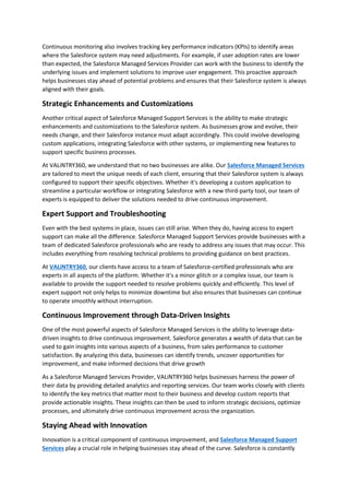 Salesforce managed support services help businesses optimize their operations and drive continuous improvement by providing expertise and specialized support for maintaining and enhancing Salesforce systems. Valintry360 offers a comprehensive suite of services, including continuous monitoring, strategic enhancements, expert troubleshooting, and data-driven insights, ensuring that Salesforce instances adapt to evolving business needs. Partnering with Valintry360 allows organizations to achieve cost efficiency, scalability, and peace of mind while focusing on their core activities.