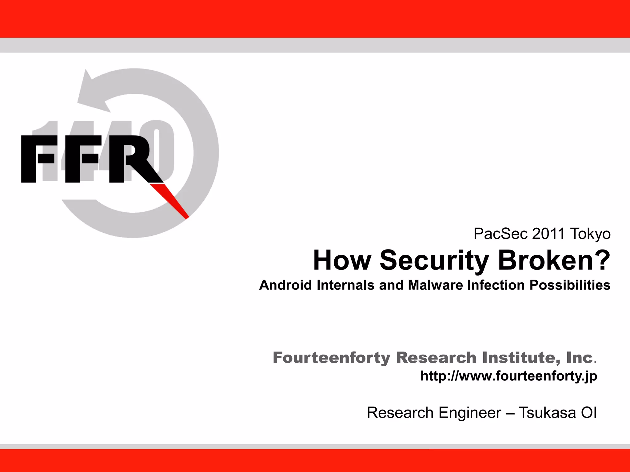This document discusses security issues in the Android operating system and possibilities for malware infection. It begins by covering kernel-level protections like DEP and ASLR, which are not fully effective in Android due to issues like prelinking neutralizing ASLR. It then discusses the application layer, explaining Android application internals involving packages, permissions, and intent-based features like activities and broadcasts. Finally, it outlines the evolution of Android malware, characteristics like using intents and premium services, issues with anti-virus software's limited privileges, and how rooting breaks security by enabling malware to gain higher privileges.
