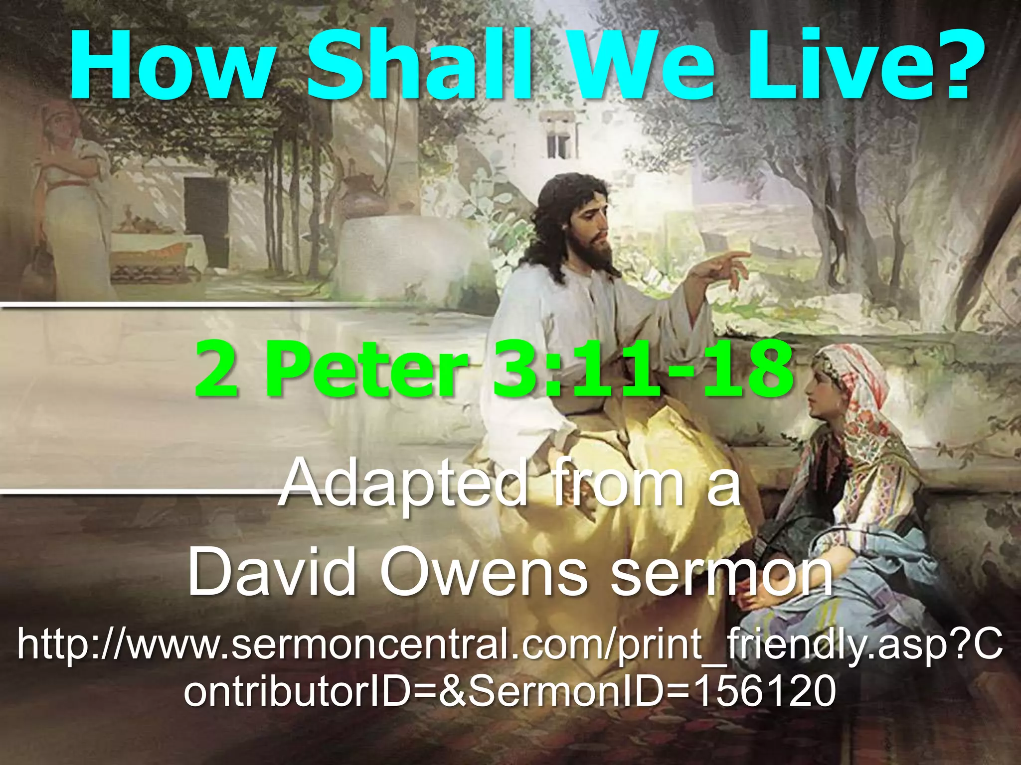 The document discusses the significance of living a godly life in anticipation of Christ's return, emphasizing the importance of holiness and godliness as a response to being saved and the promise of eternity. It draws from various scripture passages, particularly focusing on 2 Peter, which encourages believers to make every effort to adhere to their faith and live righteously while awaiting Christ's second coming. The text further warns against false teachings and underscores the need for believers to actively spread the gospel and cultivate their relationship with God.