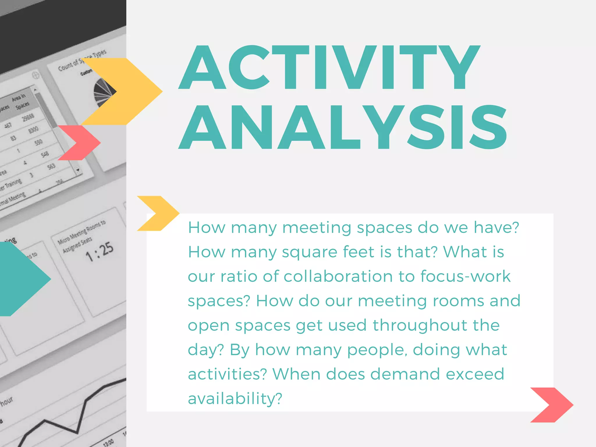 FacilityQuest provides space utilization studies and workplace strategy solutions to help organizations understand how their existing space is used. The studies analyze activity, utilization metrics, and other data to determine how many meeting spaces are available, how many square feet they encompass, the ratio of collaboration to focus work spaces, and how these spaces are used throughout the day. This data helps support decisions around planning new workplace strategies as workforce changes accelerate and more information is needed about where and how employees work. FacilityQuest quickly gathers existing data and floor plans and visually displays analytics to help answer questions about space performance.