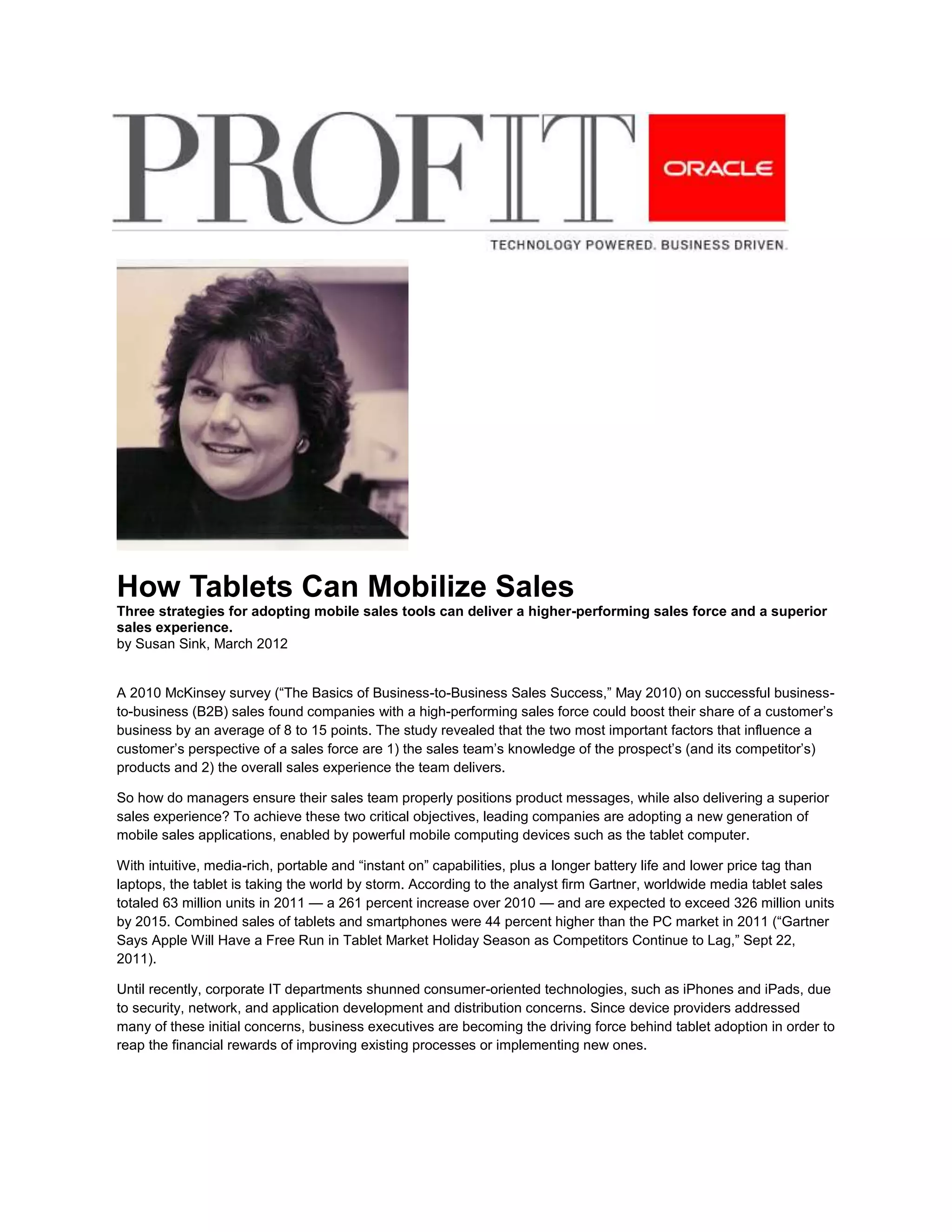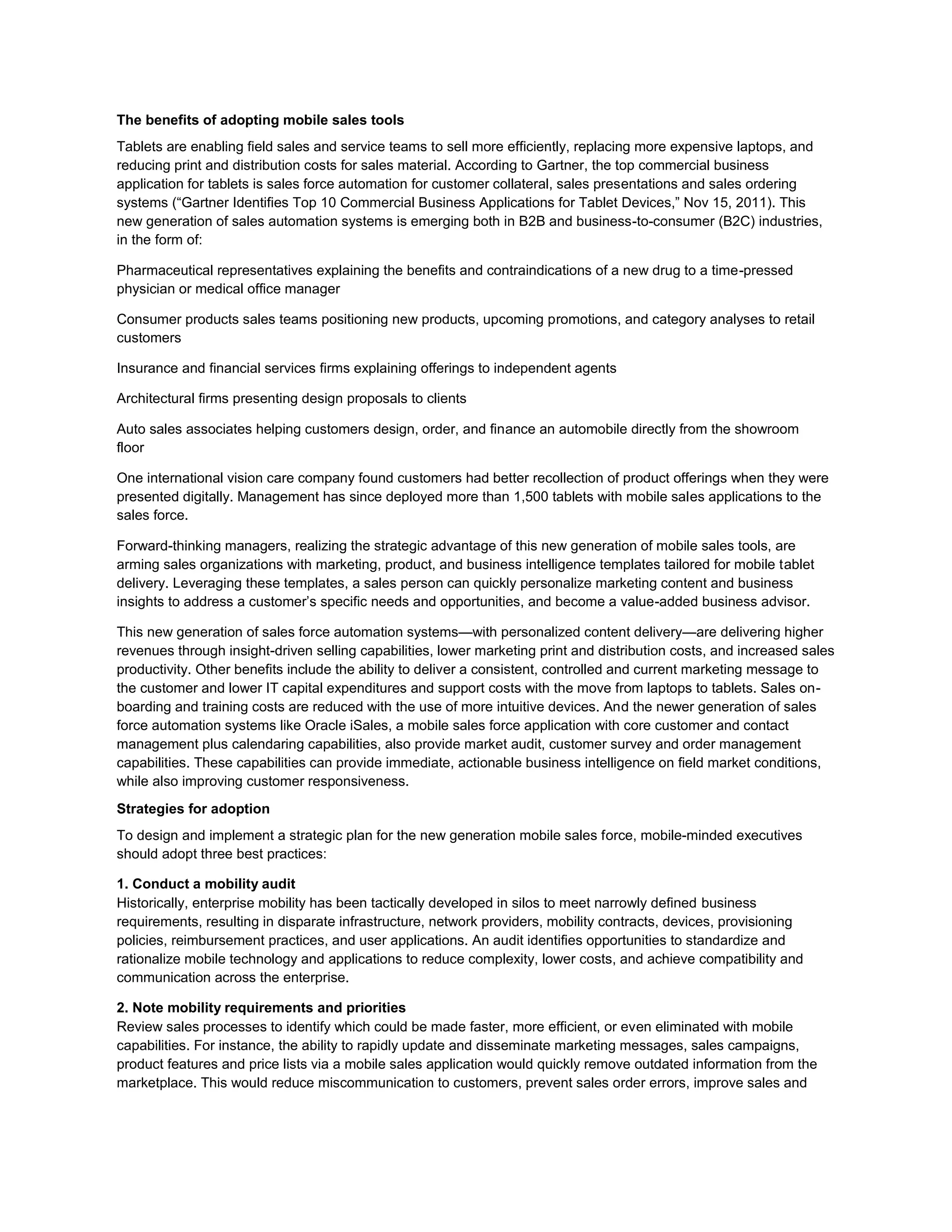Tablets are becoming widely adopted mobile sales tools that can improve sales performance. They enable salespeople to efficiently present customized product information and business insights to customers. Leading companies are deploying mobile sales applications on tablets that allow personalized content delivery, which increases sales productivity and revenues through insight-driven selling. Managers should conduct a mobility audit, understand requirements, and create a strategic sales mobility plan to successfully adopt mobile sales tools.