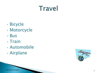 This document discusses how technology has changed various aspects of modern life including travel, communication, education, meals, home comforts, appliances, computing, music, health, work, shopping, and lifestyles. It covers the evolution of modes of travel, communication technologies, distance learning tools, food preservation methods, home appliances, computers, music formats, medical advancements, impacts on work efficiency and production, and online shopping options. However, it also notes that technology has not changed everyone's lifestyle as the Amish community still avoids most forms of technology.