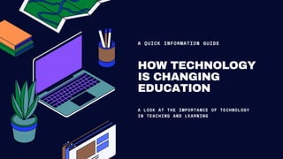 This document discusses how technology is changing education. It outlines how technology has provided greater access to education materials and more tools for communication and collaboration. It also discusses how virtual classrooms are now used in 95% of schools worldwide. The benefits of interactive technology for both teachers and students are explored, such as more personalized learning and improved communication skills. The document concludes that technology is an effective tool that can enhance education when used properly.