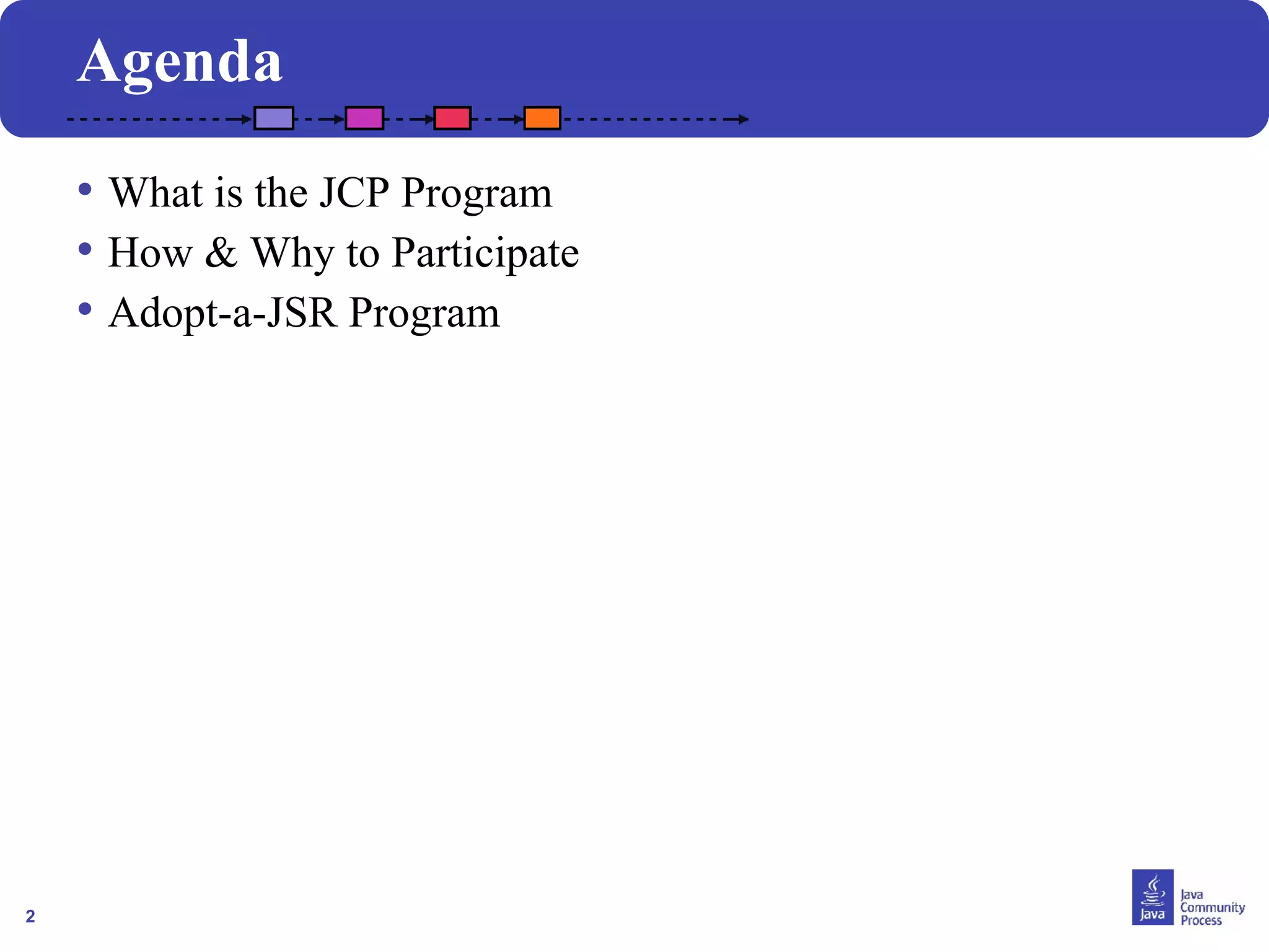 The document discusses the Java Community Process (JCP) program, which is the open process for developing and revising Java technology specifications, reference implementations, and technology compatibility kits. It provides an overview of how the JCP works, including the roles of specification leads, expert groups, and the executive committee in developing specifications. It encourages participation in the JCP through various levels of involvement and describes benefits such as influencing technologies and gaining knowledge.