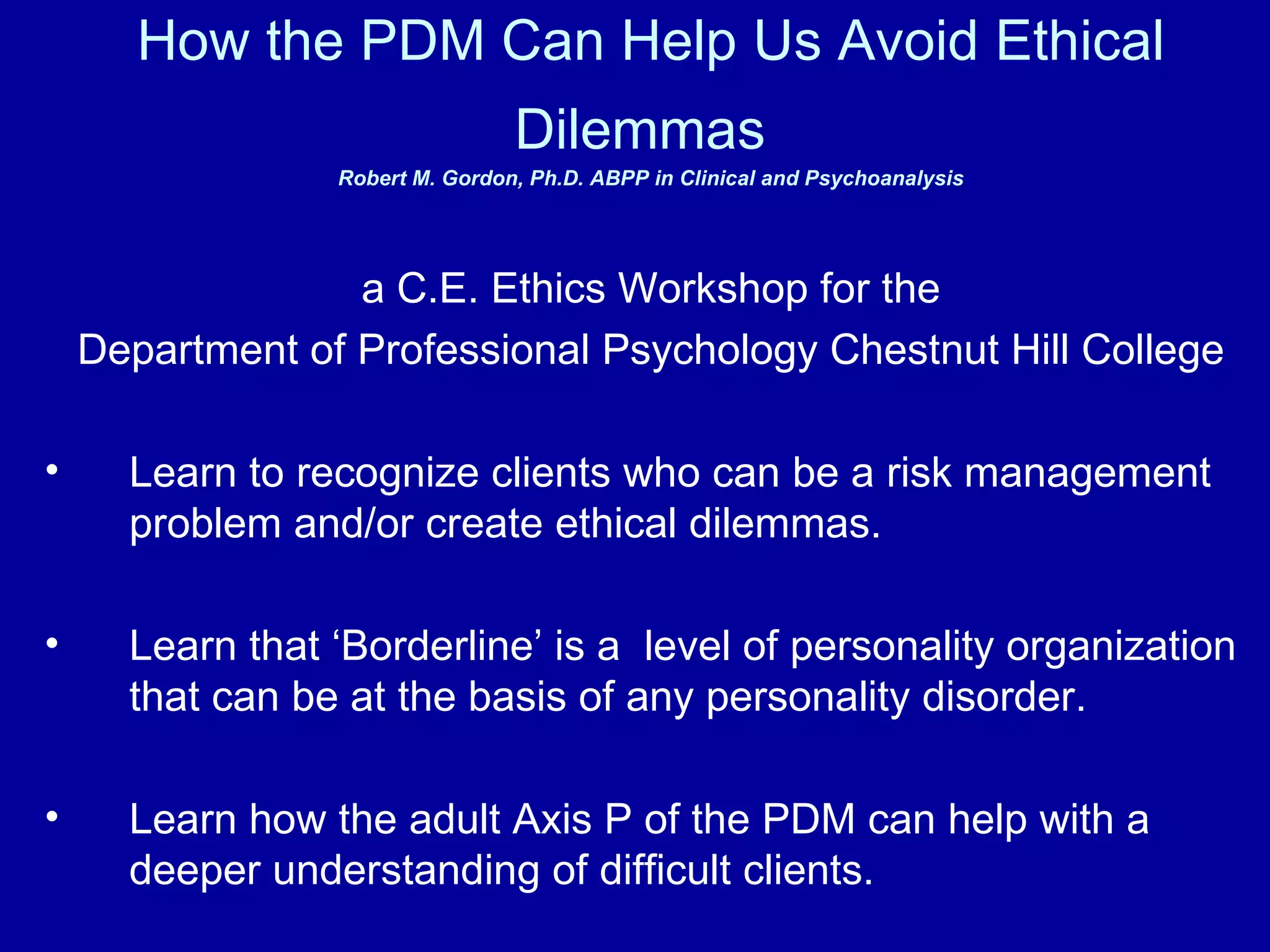 The document discusses the importance of using the Psychodynamic Diagnostic Manual (PDM) to better understand clients with borderline personality organization and avoid potential ethical issues. It describes how the PDM framework helps clinicians recognize clients who may pose risk management problems or ethical dilemmas, understand borderline as a level of personality rather than a narrow set of symptoms, and provide a deeper understanding of difficult clients.